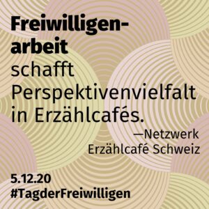 Zum Internationalen Tag der Freiwilligen am 5.12.2020 haben viele Organisationen und Menschen in der ganzen Schweiz Botschaften zur Freiwilligenarbeit geschrieben. So auch das Netzwerk Erzählcafé, das sich für das Miteinander und den Dialog in der Schweiz einsetzt. Hier finden Sie die Galerie mit allen Botschaften.