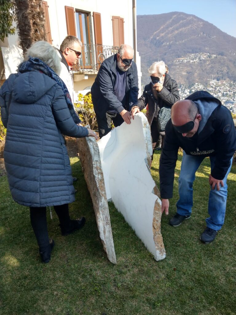 Lorenza hatte folgende Idee: ein Nachmittag, an dem blinde/sehbehinderte Menschen und sehende Personen im Rahmen einer taktilen Besichtigung des Museums dieselben Empfindungen erleben können. Wir hatten das Privileg, die Skulpturen anfassen zu dürfen und die Bildhauerin dabeizuhaben, die mit Anekdoten und Geschichten über ihre Werke einen wichtigen Beitrag zu diesem Nachmittag leistete. Damit alle Teilnehmenden dieselbe Erfahrung machen konnten, erhielten die sehenden Personen verdunkelnde Augenmasken. Nach diesem taktilen Erlebnis wurde ein Erzählcafé zum Thema «Kontakt» durchgeführt.
